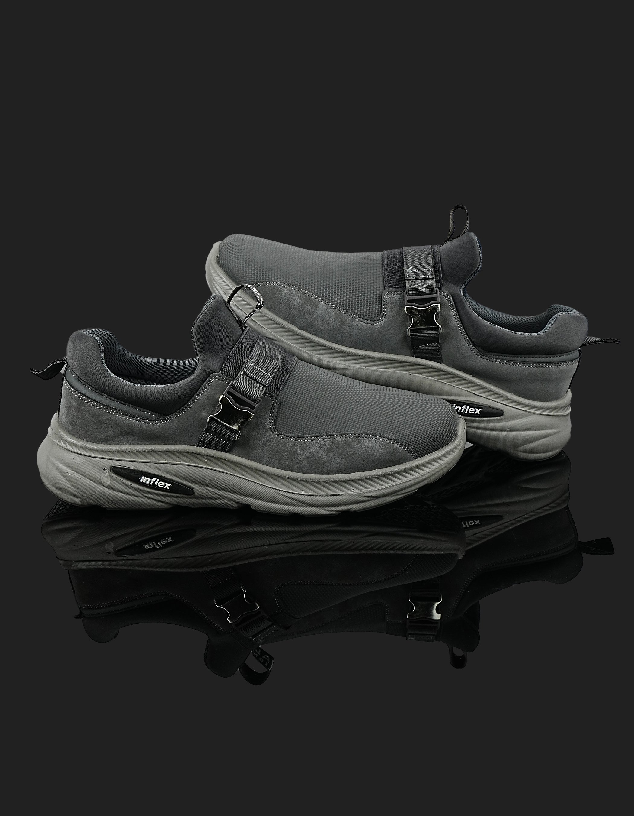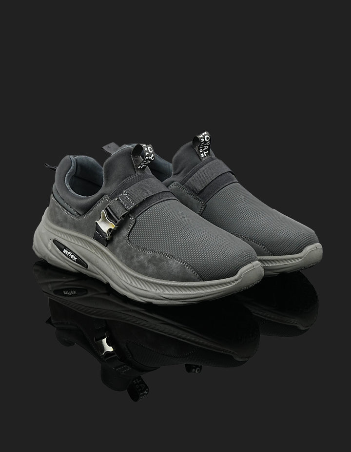 The K-812 Dark Grey Slip-On Sports Shoes deliver modern style with ultimate comfort. Featuring a breathable mesh upper, padded lining, and supportive sole, these shoes are designed for all-day wear. The metallic side buckle adds a fashionable edge to your sporty look.