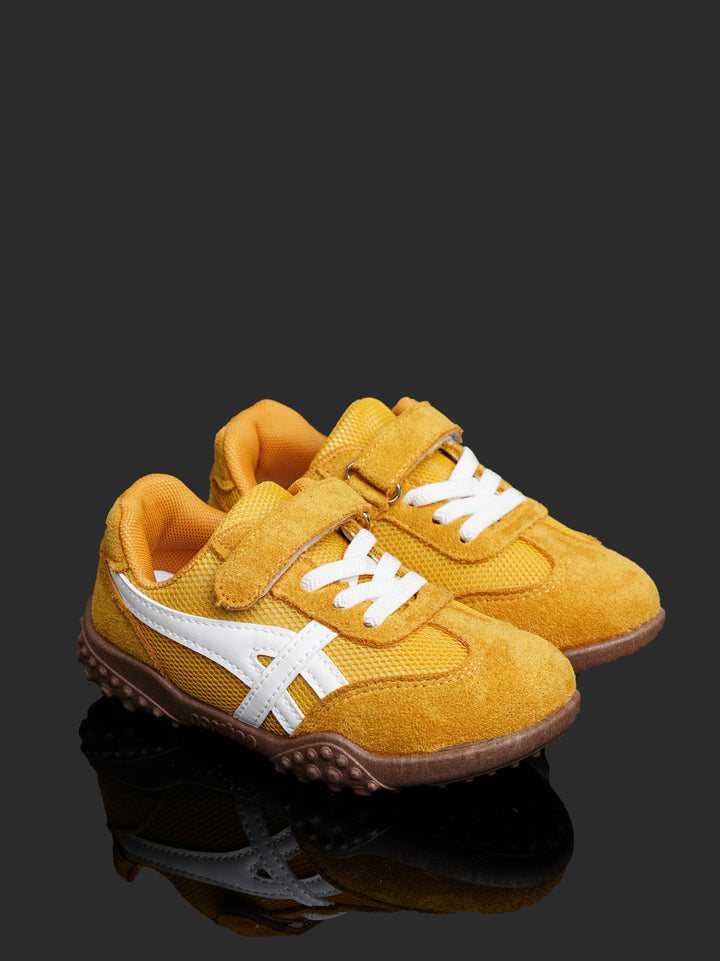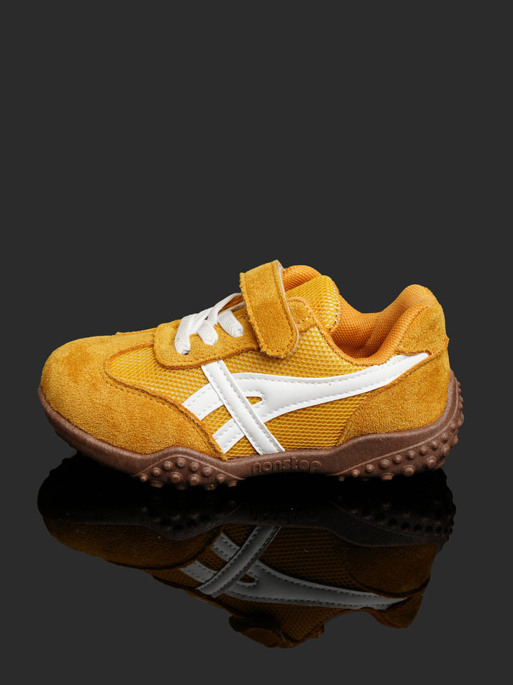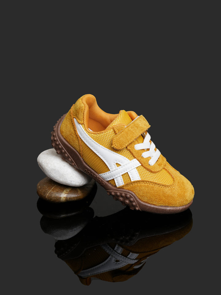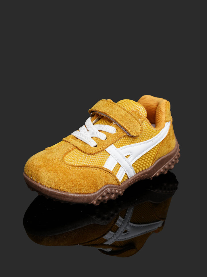 Brighten up playtime with these cheerful Toddler/Kids' Retro Play Sneakers! Featuring a sunny Mustard Yellow/Gold color with crisp white accents and a contrasting brown sole, these shoes offer a fun, sporty look that keeps up with the most active little feet.