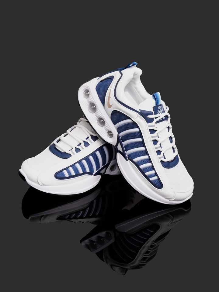 Responsive Cushioning: The robust white midsole features visible, metallic-accented air pods in the heel for superb impact protection and a light, responsive step.