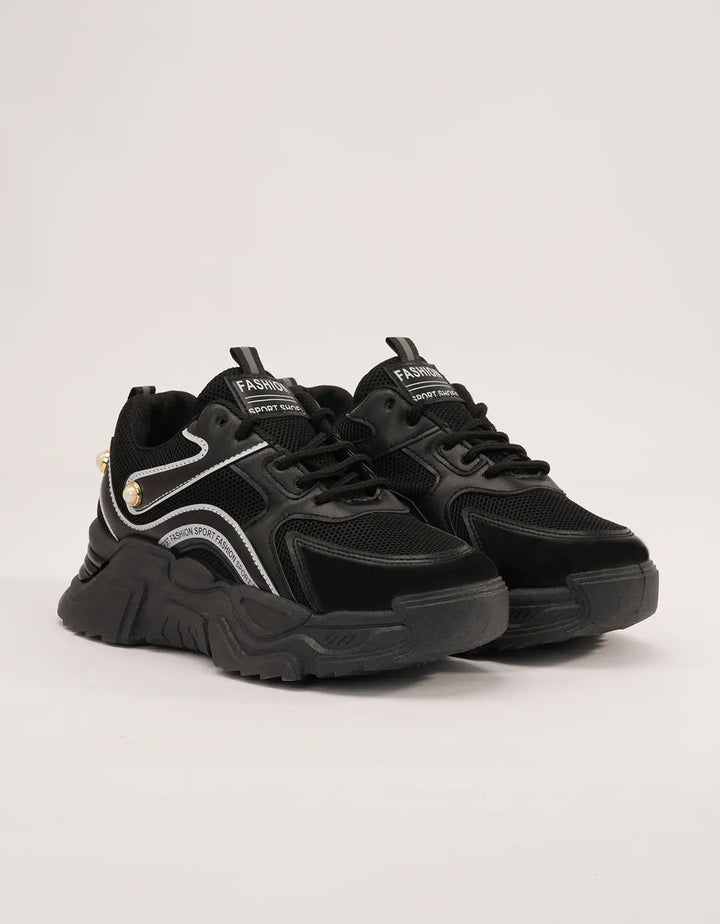 Discover the ultimate blend of sport and style with our Jet Set Black Sporty Sneakers. These all-black sneakers are a wardrobe staple for those who appreciate a sleek, monochrome look. The robust construction ensures they can keep up with your dynamic lifestyle, while the fashionable design keeps you looking sharp. Ideal for the active fashionista, they'll be your go-to for any adventure.